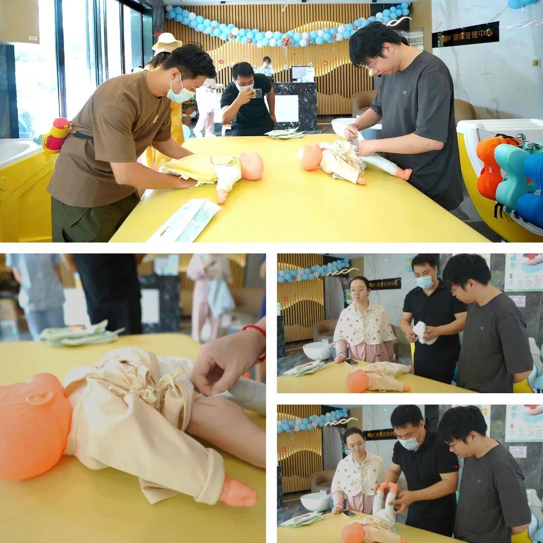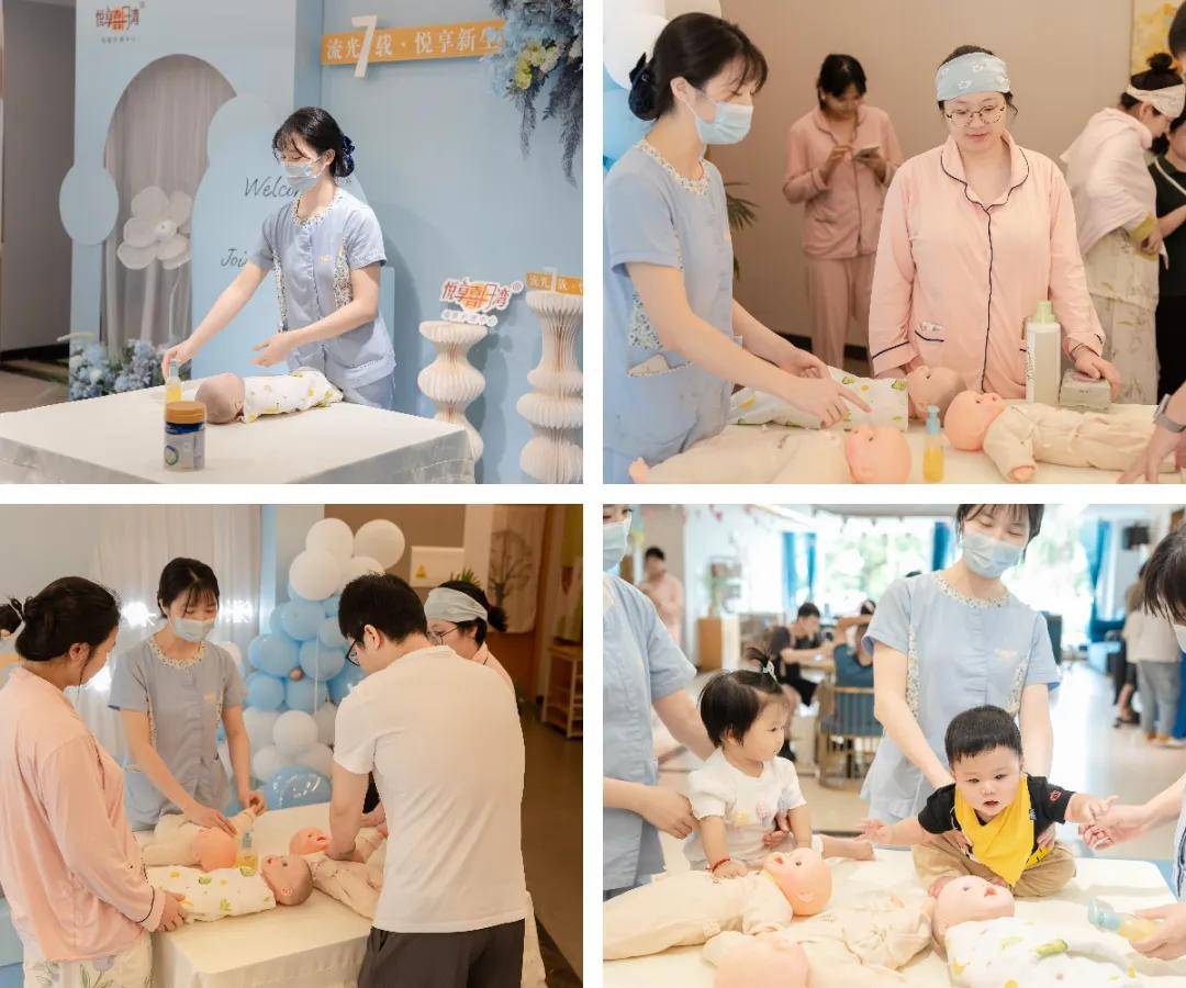 护士小姐姐现场演示新生儿沐浴抚触全流程,新手爸妈们举着手机记录,连连赞叹:“原来托脖、擦润肤乳都有这么多门道!”