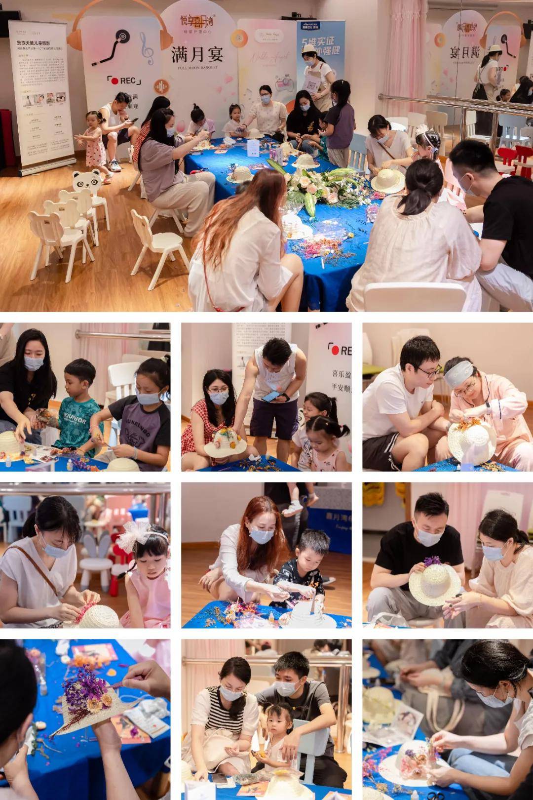 草叶清香中,大手小手交织编就夏日童梦。宝爸固定草帽雏形,宝妈教宝宝缠绕波点丝带;一位宝妈为宝宝戴上成品:“送的不只是草帽,是悦享喜月湾的美好回忆!”